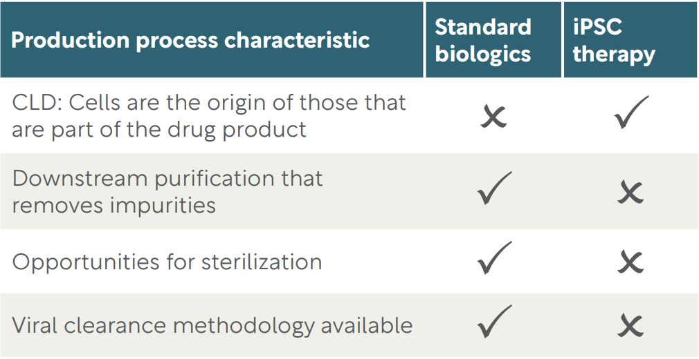 The CLD steps are not easily amenable to a process fully compliant with Good Manufacturing Practice (GMP). Unit operations may include single-cell printing to high-throughput plates, analysis of clonal outgrowth, and picking and analysis of clones with ideal phenotypic characteristics. These are non-routine, difficult-to-document procedures often carried out in open cell culture systems and equipment designed for R&D CLD activities that are acceptable for standard biologic drugs (e.g. recombinant antibodies). However, unlike biologics, the resulting cell lines will be the active ingredient of iPSC-derived products, with few opportunities for impurity removal and no options for viral clearance or sterilization (Table 1). Consequently, iPSC cell line development demands greater reliance on quality and safety assurance than standard biologics.